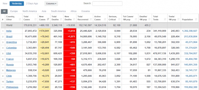Детали: В частности, в Индии - 174 041 новый случай, в Бразилии - 78 943, в Аргентине - 29 841.