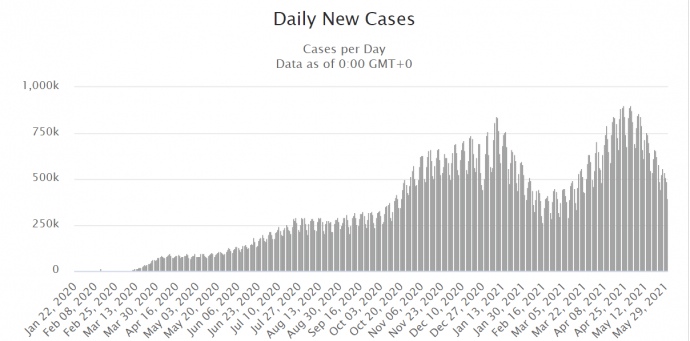 За сутки 29 мая в мире обнаружили 398 811 больных COVID-19. Это самый низкий показатель с 15 марта, когда зафиксировали около 339 тысяч больных.