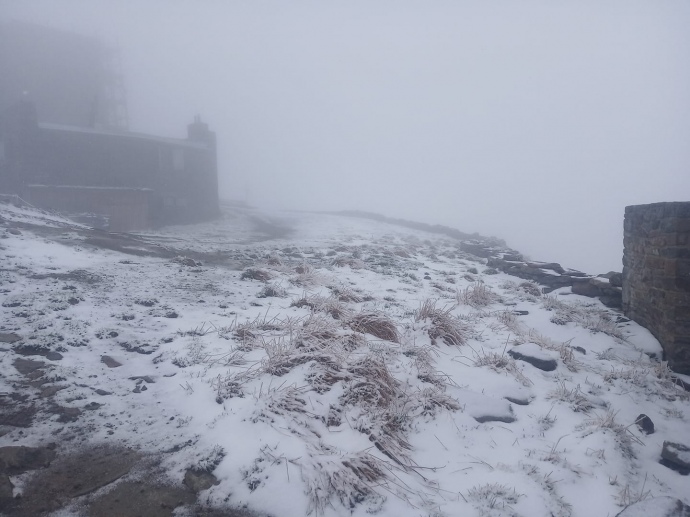 Дословно: "По состоянию на 9:30 31.05.2021 на г. Поп Иван Черногорский облачно, падает снег. Видимость ограничена до 50 м. Ветер северо-восточной 8-10 м/с. Температура воздуха 0°С".