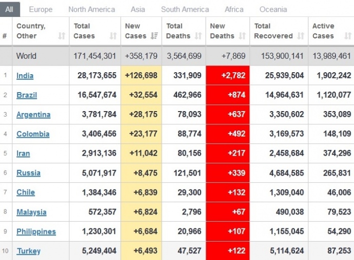 За минувшие сутки в мире диагностировали почти 358 000 новых случаев заболевания коронавирусом. Больше всего больных обнаружили в Индии, Бразилии, Аргентине. Украина среди стран мира занимает 44 место по количеству новых заражений.