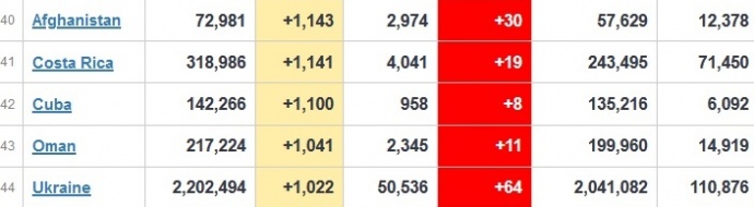 В мировом рейтинге Украина оказалась на 44 месте по распространению коронавируса