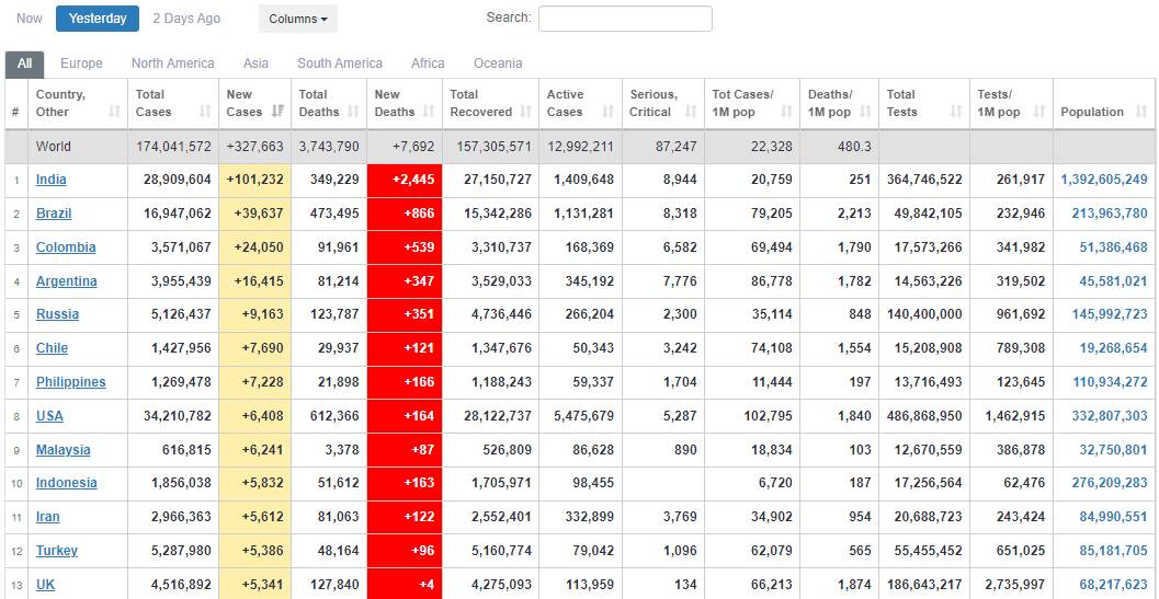 Детали: В частности, в Индии - 101 232 заражения, в Бразилии - 39 637, в Колумбии - 24 050.