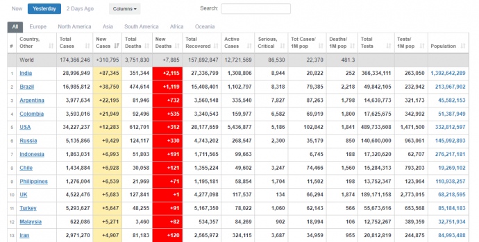 Детали: В частности, в Индии - 87 345 новых случаев, в Бразилии - 38 750, в Аргентине - 22 195.