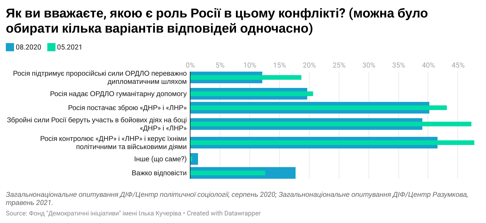 Роль России в этом конфликте заключается в контроле так называемых "ДНР" и "ЛНР" и управлении их политическими и военными действиями (48%), участия Вооруженных Сил России в боевых действиях на стороне "ДНР" и "ЛНР" (47%) и поставках оружия этим самопровозглашенным формированиям (43%). Кроме этого, 35% считают, что Россия оказывает гуманитарную помощь ОРДЛО, а 27% - что Россия поддерживает псевдореспублики преимущественно дипломатическим путем.