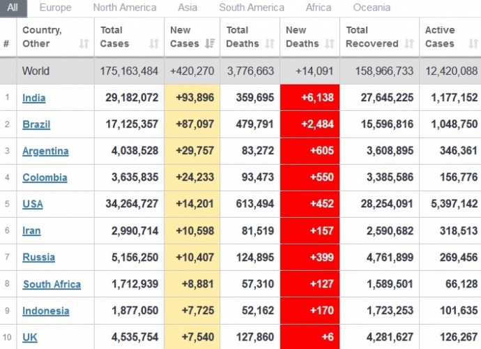 Детали: В частности, в Индии зафиксировали почти 94 тысячи новых заражений, в Бразилии – более 87 000, а в Аргентине – почти 29 000 случаев.
