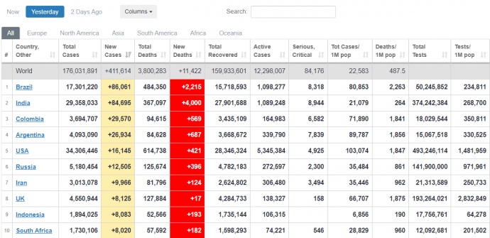 Детали: В частности, в Бразилии - 86 061 случай, в Индии - 84 695, в Колумбии - 29 570.