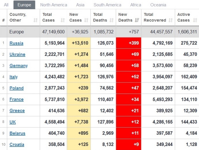 За все время пандемии вылечились от недуга 160 359 997 человек. Сейчас насчитывается более 12 млн активных случаев заболевания.
