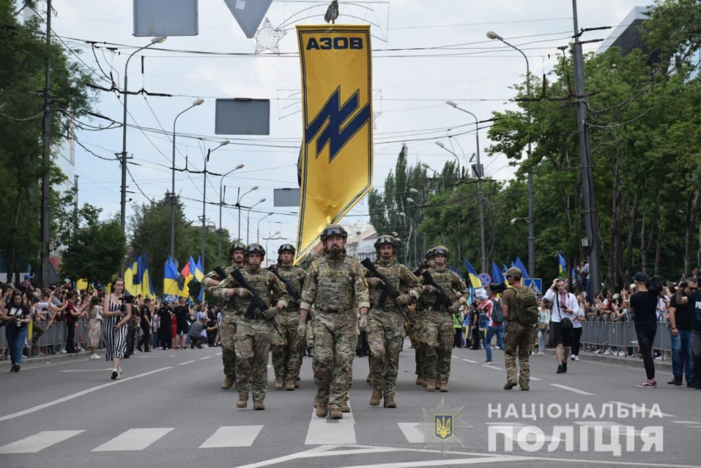 Детали: Центральным проспектом до Театральной площади двинулась колонна военной техники и пешая колонна представителей силовых структур: работники Нацполиции Украины, полка "Азов", военнослужащие, спасатели и курсанты ДонДУВД МВД Украины.