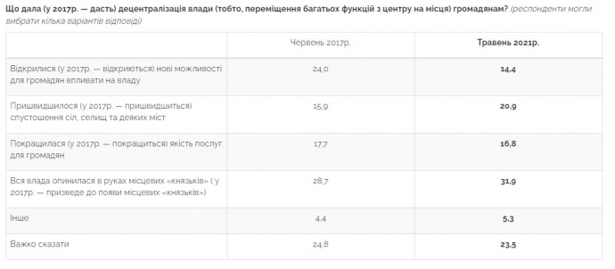 Отвечая на вопрос, что дала децентрализация власти (т.е. перемещение многих функций из центра на места) гражданам, 32% опрошенных отметили, что вся власть оказалась в руках местных "князьков", 21% - что ускорилось опустошение сел, поселков и некоторых городов, 17% - что улучшилось качество услуг для граждан, 14% - что открылись новые возможности для граждан влиять на власть.