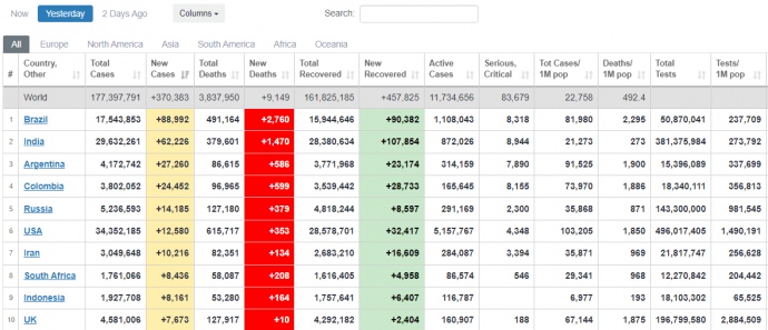 Детали: В частности, в Бразилии - 88 992 случая, в Индии - 62 226, в Аргентине - 27 260.