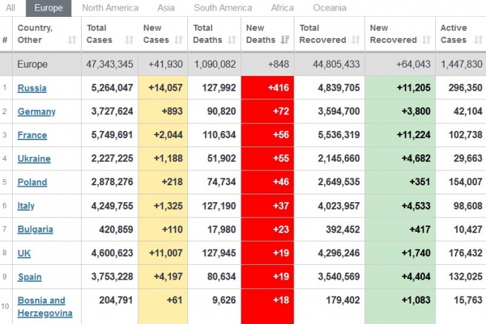 Суточная смертность от COVID-19 в Европе: Россия лидирует, Украина – в 5-ке