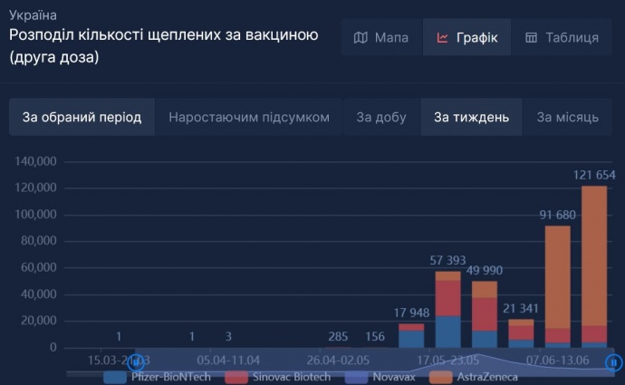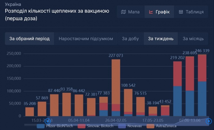 В течение прошлой недели, с 14 по 20 июня, украинцы получили рекордные 367 тысяч прививок против коронавируса.