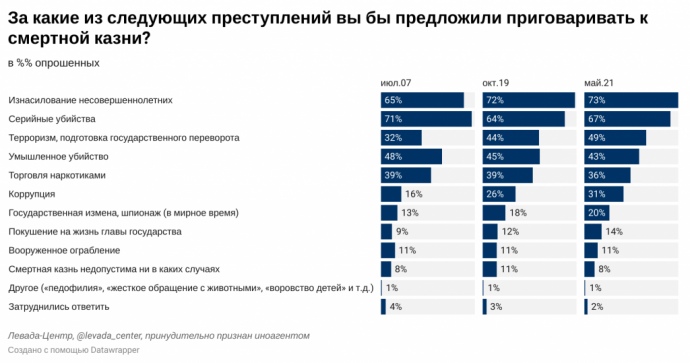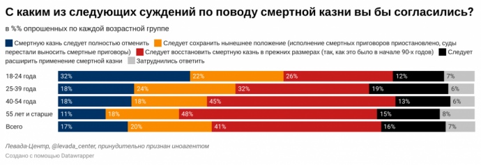 Дословно: "Этот показатель, достигнув минимума в 31% в 2015 году, вырос на 10 п.п. за 6 лет. Одновременно с этим доля тех, кто считает, что нужно сохранить нынешнее положение, сократилась с 27% летом 2015 года до 20% в 2021 году. 17% считают, что смертную казнь нужно полностью отменить, 16% уверены – нужно расширить применение смертной казни".