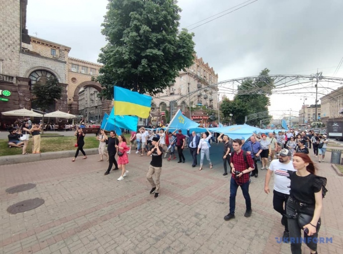 В Киеве по улице Крещатик несколько сотен человек устроили шествие в честь Дня крымскотатарского флага.