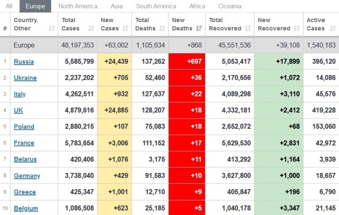 В Европе по суточной смертности лидируют Россия, Украина, Италия.