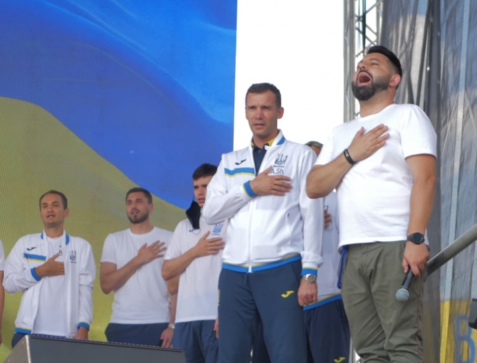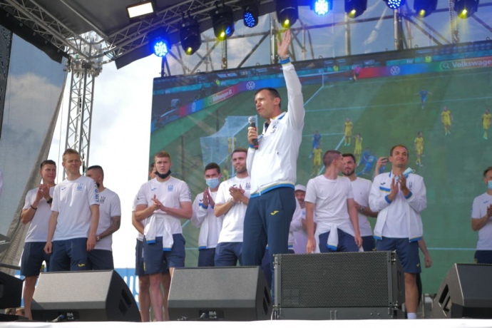 Перед фанатами выступил тренер сборной Андрей Шевченко. Он закончил свое выступление, трижды произнеся "Слава Украине!".