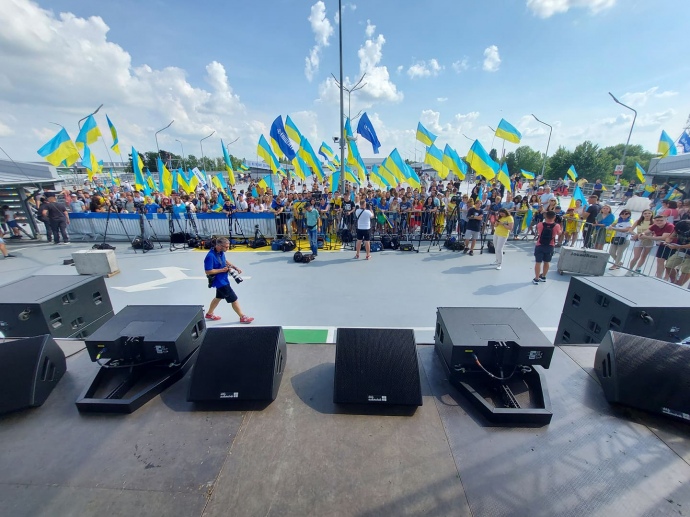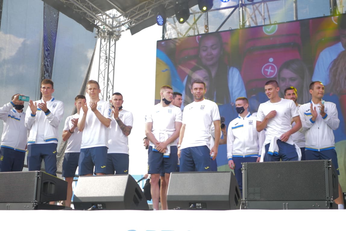 Вместе с болельщиками, приветствовали футболистов гимном Украины музыканты – лидер группы Скай Олег Собчук, певец Фоззи из ТНМК и рэпер Ярмак.