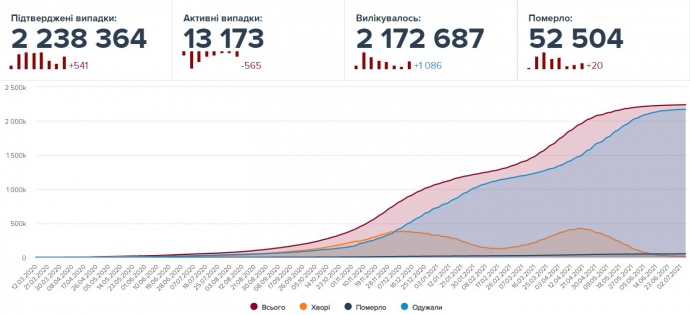 За все время пандемии в Украине коронавирус обнаружили у 2 238 364 человек, из них 2 172 687 человек выздоровели, а 52 504 человека умерли.