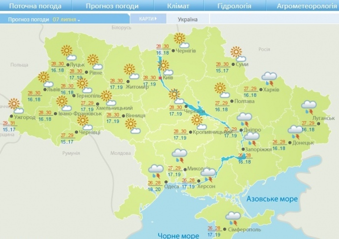 Согласно прогнозу на 8-9 июля, осадки вероятные лишь 8 июля ночью на крайнем юге, днем в Карпатах местами небольшой кратковременный дождь, гроза. Ветер северо-восточный, в западных и северных областях юго-восточный, 5-10 м / с. Температура ночью 15-20°, днем 27-32°.