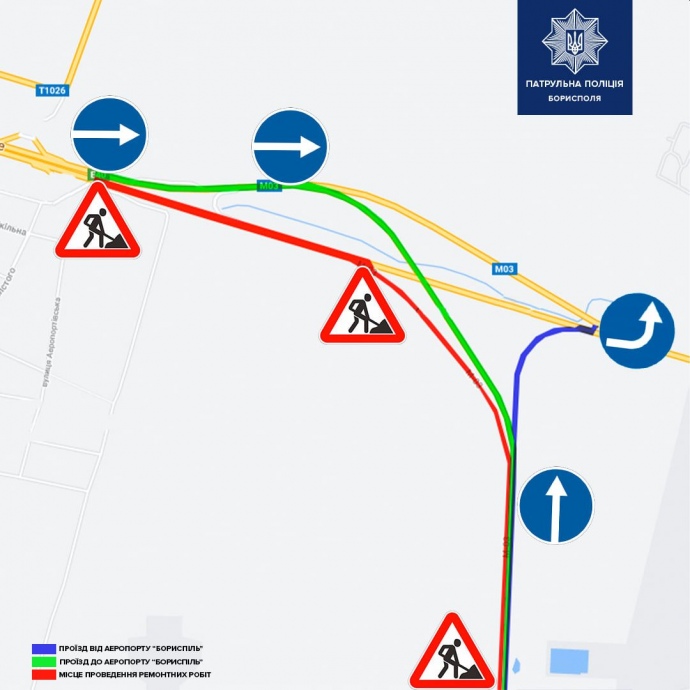 Дословно аэропорт: "Временно изменена организация дорожного движения на подъезде к аэропорту "Борисполь". Изменения связаны с капитальным ремонтом автомобильной дороги М-03 Киев-Харьков-Довжанский, подъездная дорога к аэропорту. Ремонтные работы продлятся с 9 по 14 июля.