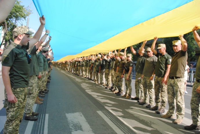 В центре Мариуполя в воскресенье бойцы Закарпатского легиона установили рекорд Украины по наибольшему количеству военнослужащих, которые развернули Государственный флаг Украины.