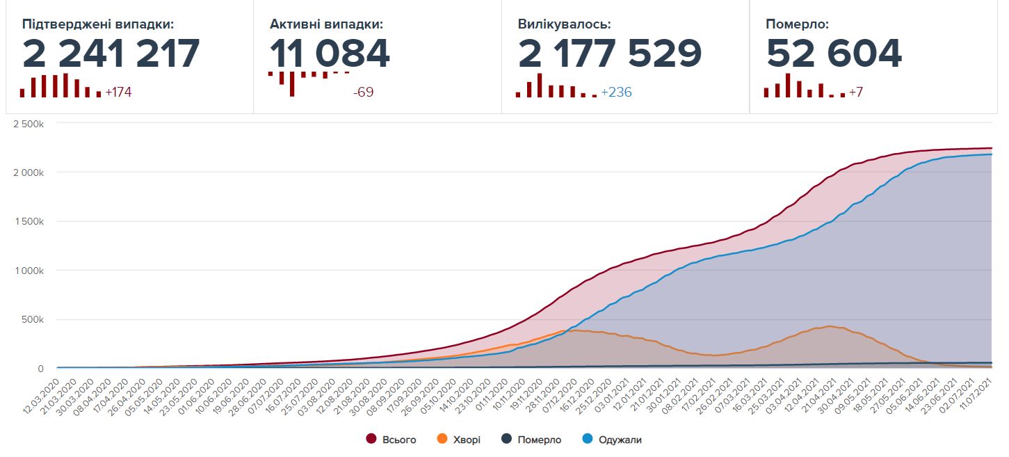 За сутки 11 июля в Украине зафиксировали 174 новых подтвержденных случая COVID-19, госпитализировали с коронавирусной болезнью или подозрением на нее 266 человек, умерли 7 больных, выздоровели 236 человек.