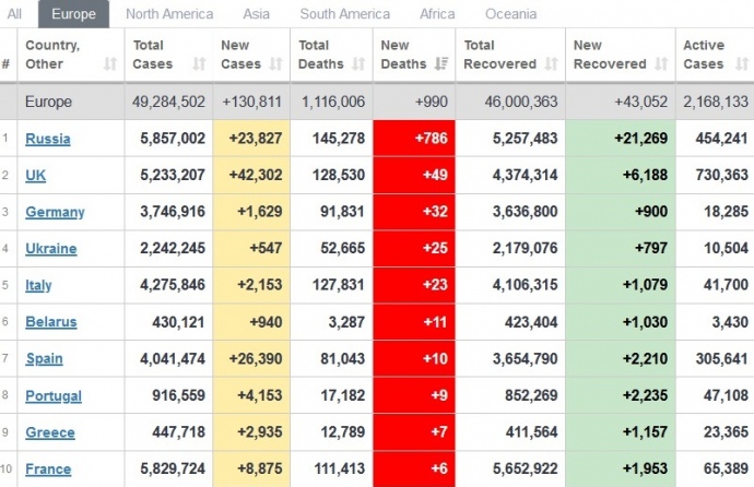 В Европе по суточному приросту болезни лидируют Великобритания, Испания, Россия, а суточной смертности от коронавируса - Россия, Великобритания, Германия, за которыми идет Украина.