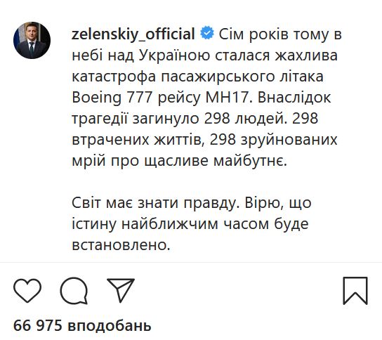 Президент Владимир Зеленский на своей странице в соцсети написал пост о катастрофе рейса MH17, даже не упомянув о том, что самолет был сбит, а ракету по "Боингу" выпустили из российского комплекса "Бук".