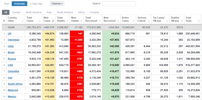 Детали: В частности, в Великобритании - 54 674 случая, в Индонезии - 51 952, в Индии - 41 283. Кроме того, в Бразилии - 34 339, а в России - 25116.