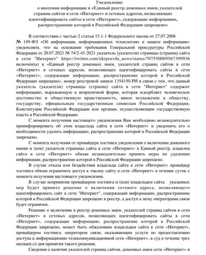 Детали: 20 июля 2021 года по требованию Генеральной прокуратуры России твит УП внесли в реестр запрещенной информации.