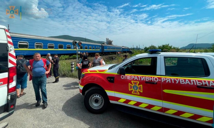 Спасатели сообщают, что там по пока неустановленной причине столкнулись пассажирский поезд №13 сообщением Киев-Солотвино и грузовой автомобиль Volvo.