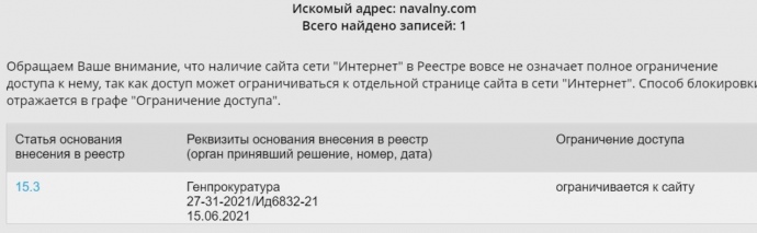 Кроме того, заблокирован доступ к сайтам соратников Навального Леонида Волкова и Любови Соболь, сайту созданного Навальным Фонда борьбы с коррупцией (ФБК, признан иноагентом и экстремистской организацией, суд принял решение о его запрете), сайтам штабов Навального (признаны экстремистской организацией и запрещены) в регионах России и т.д.