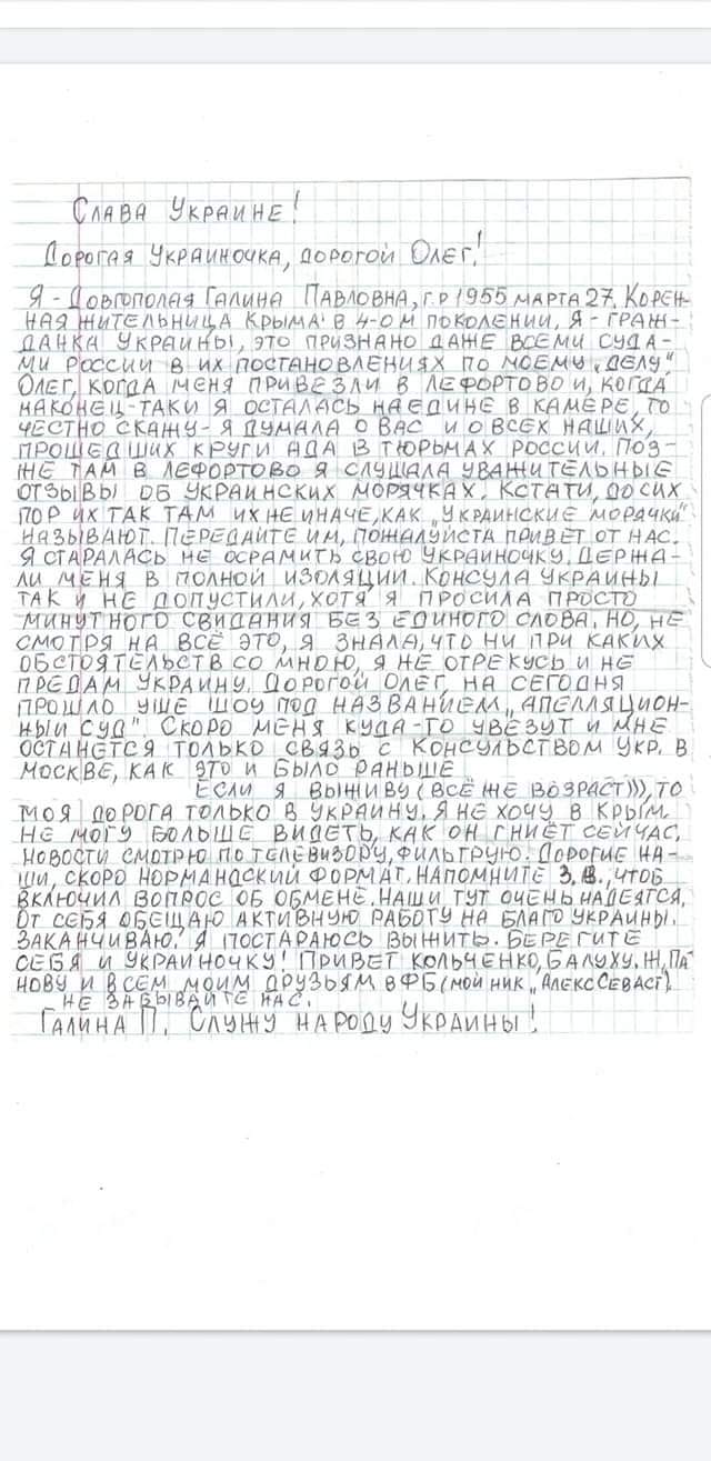 66-летняя политзаключённая Галина Довгополая написала из российской тюрьмы письмо Олегу Сенцову, в котором просит напомнить президенту Владимиру Зеленскому, чтобы тот включил вопрос обмена пленными на "нормандском формате".