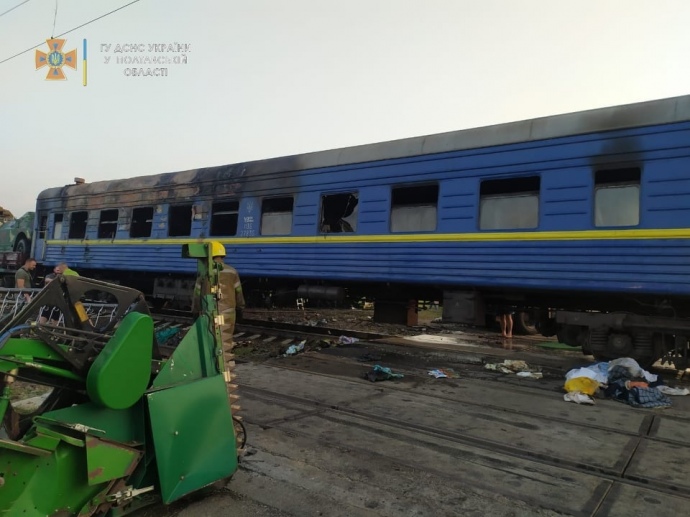 Дословно ГСЧС: "В результате столкновения грузового поезда и грузового автомобиля "MAN", который перевозил комбайн, возник пожар комбайна и одного из вагонов.