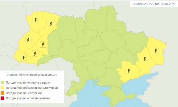 Дословно: "31 июля днем в восточных, Запорожской, большинстве западных областей грозы, в отдельных районах град и шквалы 15-20 м/с (1 уровень опасности, желтый)".
