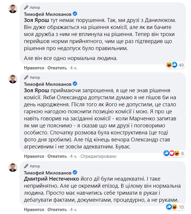 Милованов утверждает, что они с Данилюком друзья и он не знал о решении комиссии, когда принимал приглашение на день рождения: "Его действия были неадекватны. И такое неприемлемо. Но это отдельный эпизод. В целом он нормальный человек".