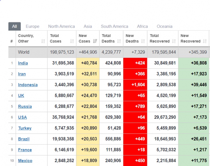 В общем, со времени начала пандемии в мире зарегистрировали почти 199 млн случаев коронавируса. Преодолели болезнь почти 180 млн больных, умерло – 4,2 человек.