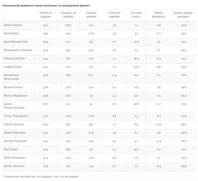 Наилучший баланс доверия и недоверия у Разумкова, наихудший у Медведчука