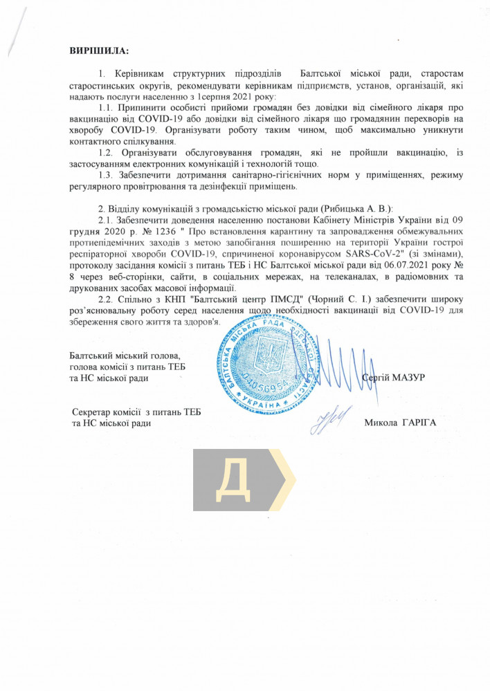 В Одесской области жителей Балтской объединенной территориальной громады не принимают в административных зданиях, если у них нет прививки против коронавируса или справки о выздоровлении от COVID-19.
