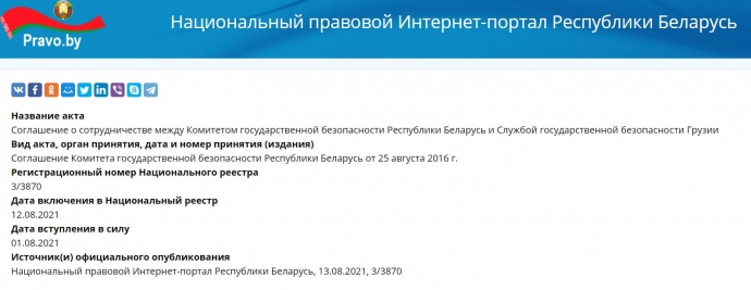 Межгосударственное соглашение о сотрудничестве Комитета госбезопасности Беларуси и Службы безопасности Грузии вступила в силу.