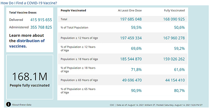 По состоянию на 14 августа в США полностью вакцинировали против COVID-19 168 миллионов 90 тысяч 925 человек, что составляет 50,6% от общей численности населения.