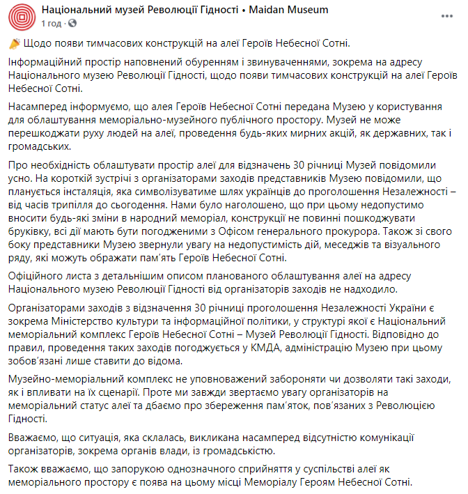 Дословно первая редакция сообщения: "Организаторами мероприятий по празднованию 30 годовщины провозглашения Независимости Украины является, в частности Министерство культуры и информационной политики, в структуре которой Национальный мемориальный комплекс Героев Небесной Сотни – Музей Революции Достоинства. Согласно правилам, проведение таких мероприятий соглашается в КГГА, администрацию музея при этом обязаны только ставить в известность".