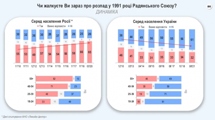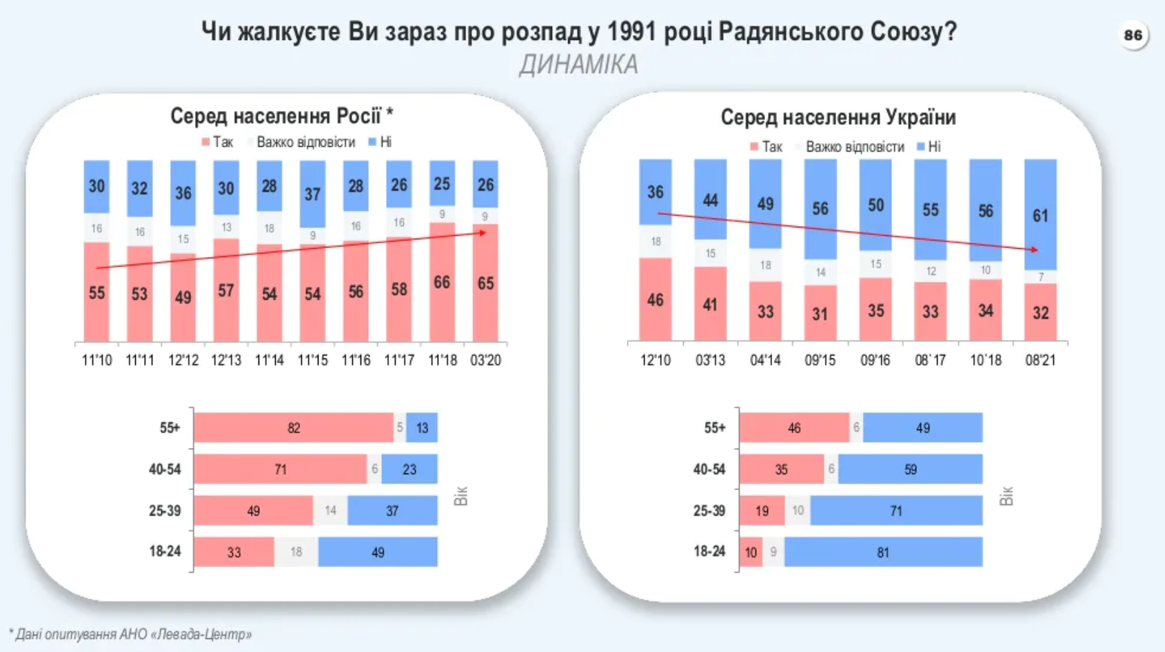 Различия в отношении к советскому прошлому среди населения России и Украины диаметрально противоположны. Если за последние десять лет уровень ностальгии по советскому прошлому в Украине постепенно снижается, то в России - растет.