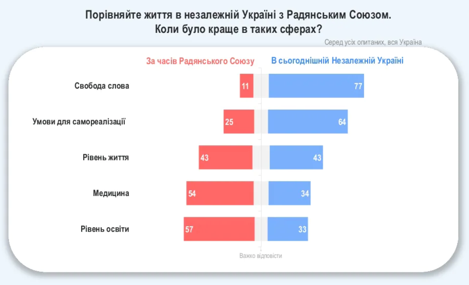 По оценке уровня медицины и образования современная Украина пока "уступает" советскому прошлом. Только те, кто родился в независимой Украине, считают, что уровень медицинских и образовательных услуг сегодня лучше. Старшие же, наоборот, оценивают современную медицину и образование значительно хуже.