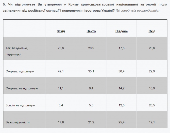 Согласно опросу, 57% граждан Украины поддерживает образование на территории Крыма крымскотатарской национальной автономии после освобождения от российской оккупации.