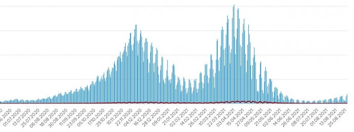 За сутки 27 августа в стране обнаружили почти 2,1 тыс. новых случаев коронавирусной болезни, 54 человека умерли от Covid.