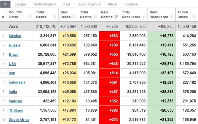 Covid в мире: по суточной смертности лидируют Мексика и Россия