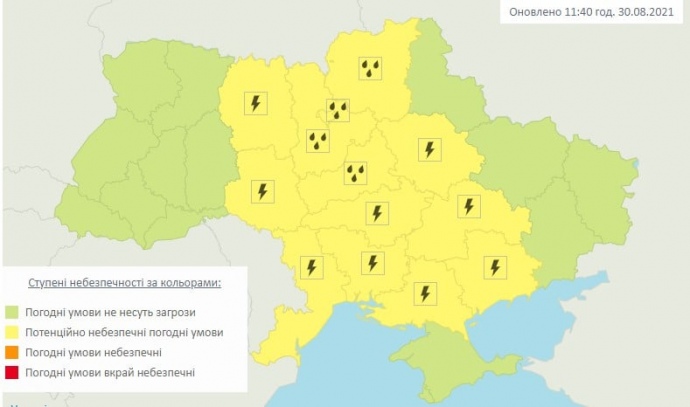Дословно: "В северных, центральных и южных областях до конца суток 30 августа и ночью 31 августа грозы, местами град и шквалы 15-20 м/с".