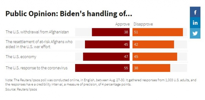 45% одобрили, а 42% не одобрили то, как администрация Байдена справилась с вывозом афганских союзников Америки.