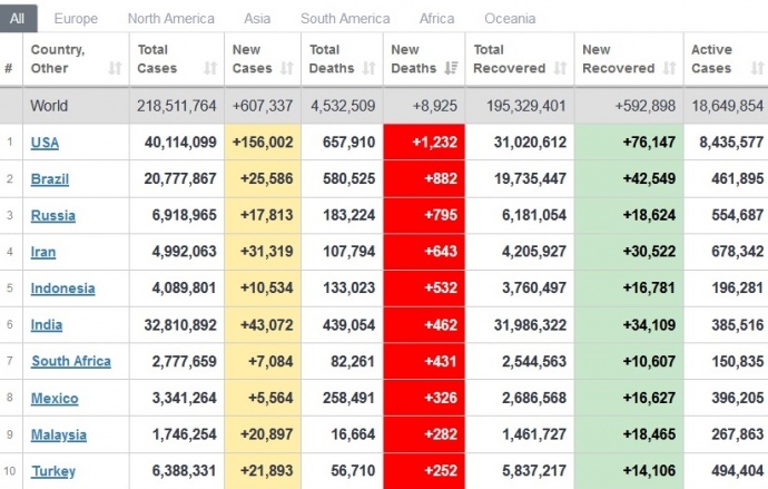 С начала пандемии подтверждено 4 533 609 смертей от COVID-19.